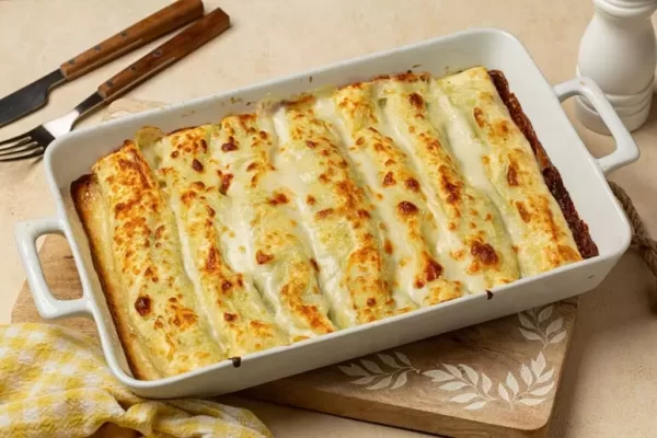 Sobre cada folha de massa de lasanha, coloque uma porção do recheio de abóbora e enrole, formando canelones. Unte um refratário com manteiga e disponha os rolinhos lado a lado. Cubra com o molho branco e polvilhe queijo parmesão por cima. Leve ao forno preaquecido a 200 °C até dourar levemente. Sirva em seguida.
