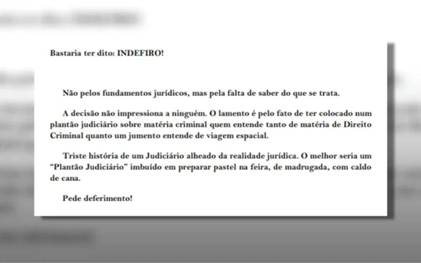 Em seguida, o advogado respondeu com uma petição classificada como “urgente”, dizendo que bastaria que a desembargadora tivesse dito “indefiro”, alegando que ela não sabia do que se tratava a situação.