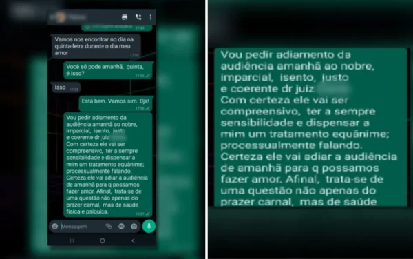 O pedido de adiamento foi feito no mesmo dia em que seria realizada a audiência, na quinta-feira (23). Ao solicitar o adiamento, o advogado justificou que se encontraria com uma mulher para poder fazer sexo e anexou prints de uma conversa em que ela falava que esse era o único dia estaria disponível.