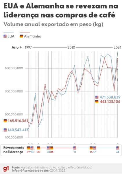 “Os EUA deixaram de ser os maiores compradores de nosso café em agosto, descendo para o segundo lugar, com 301 mil sacas importadas – de negócios realizados antes da vigência do tarifaço –, o que implicou queda de 46% ante o mesmo mês de 2024 e de 26% contra julho deste ano“, disse o presidente do Cecafé, Márcio Ferreira.