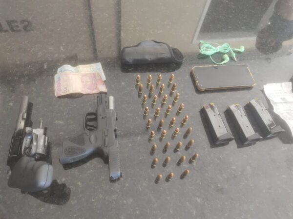 Durante as diligências, os policiais localizaram o suspeito, Na abordagem, foram encontradas duas armas de fogo, sendo, uma pistola Taurus G2C 9 mm, com 3 carregadores e 35 munições, além de uma pistola calibre 38 da marca Taurus Special, com capacidade para 5 tiros, sem munições.