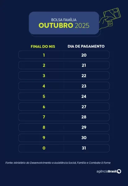A Caixa Econômica Federal começa a pagar a parcela de outubro do Bolsa Família. Recebem nesta segunda-feira (20) os beneficiários com Número de Inscrição Social (NIS) de final 1.![]()