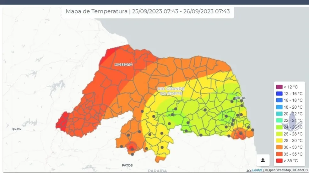 A temperatura da cidade de Caicó, localizada na região do Seridó do Rio Grande do Norte atingiu 40,04°C na tarde de segunda-feira (25), segundo o Sistema de Monitoramento da Empresa de Pesquisa do Rio Grande do Norte (Emparn).