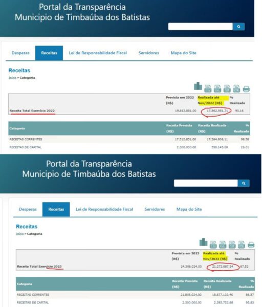 Segundo um internauta natural da terra dos bordados, conforme o Portal da Transparência, o município de Timbaúba dos Batistas, no Seridó do Rio Grande do Norte, recebeu no ano de 2023, o total de R$ 3.409.935,53 (três milhões, quatrocentos e nove mil, novecentos e trinta e cinco reais e cinquenta e três centavos) a mais em comparação com 2022.