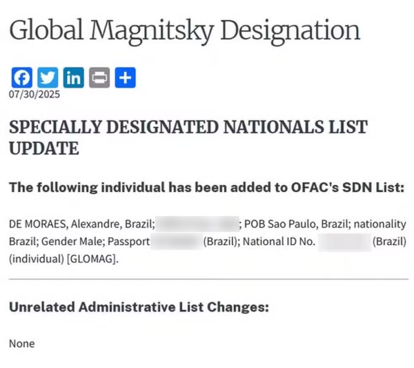 O governo de Donald Trump, nos Estados Unidos, sancionou nesta quarta-feira (30) o ministro do STF Alexandre de Moraes com a lei Magnitsky, utilizada para punir estrangeiros. A decisão foi publicada pelo Escritório de Controle de Ativos Estrangeiros do Tesouro norte-americano.