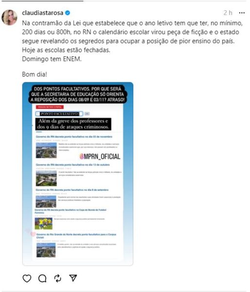Em seu perfil, no Thread, rede social da Meta, Santa Rosa disse que “na contramão da Lei que estabelece que o ano letivo tem que ter, no mínimo, 200 dias ou 800h, no RN o calendário escolar virou peça de ficção”.