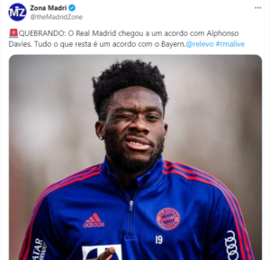 Alphonso Davies, (que é atleta do Bayern de Munich) teve na última quinta-feira (dia 15 de fevereiro), uma notícia que logo espalhou-se: veja na imagem a seguir.