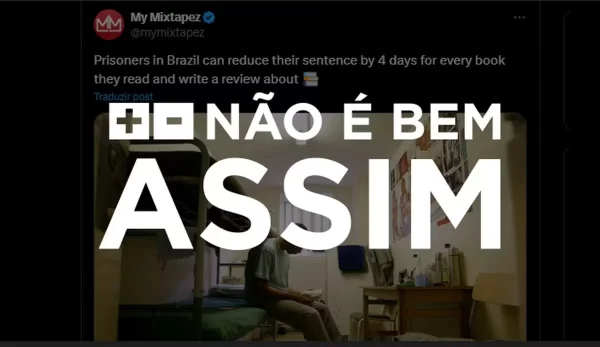 • Um post feito no X no dia 14 de abril de 2025, visto mais de 16 milhões de vezes, traz a informação de que pessoas detentas no Brasil podem diminuir a pena através da leitura e avaliação de obras escritas. Originalmente em inglês, a legenda diz: “Presos no Brasil podem reduzir a pena em 4 dias por cada livro que lerem e escreverem uma resenha📚”.