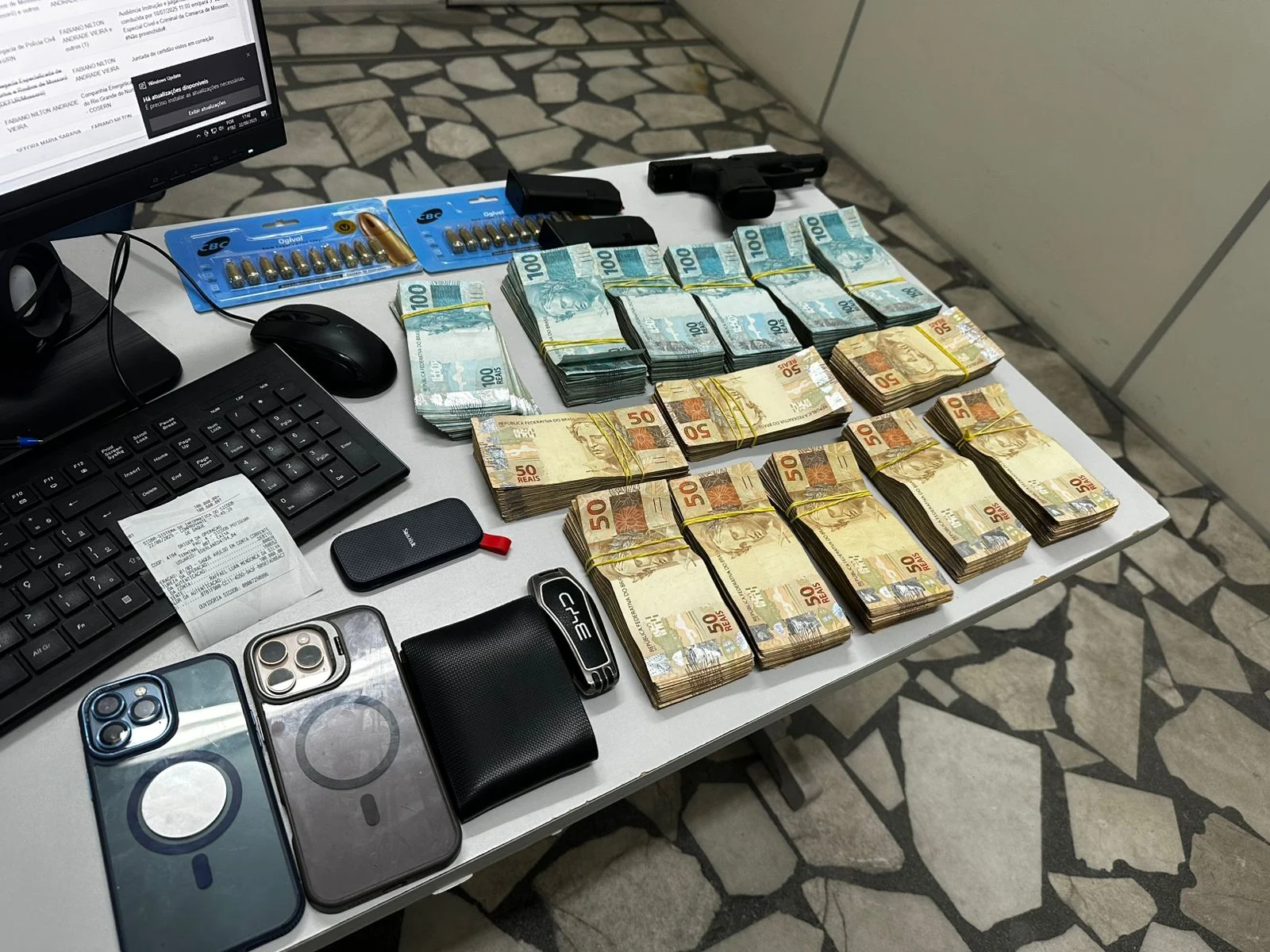 Durante a prisão, a polícia apreendeu R$ 100 mil em espécie, além de uma arma de calibre restrito e diversas munições. Paralelamente, mandados de busca e apreensão foram cumpridos em cinco endereços ligados ao suspeito, todos autorizados pela Justiça.