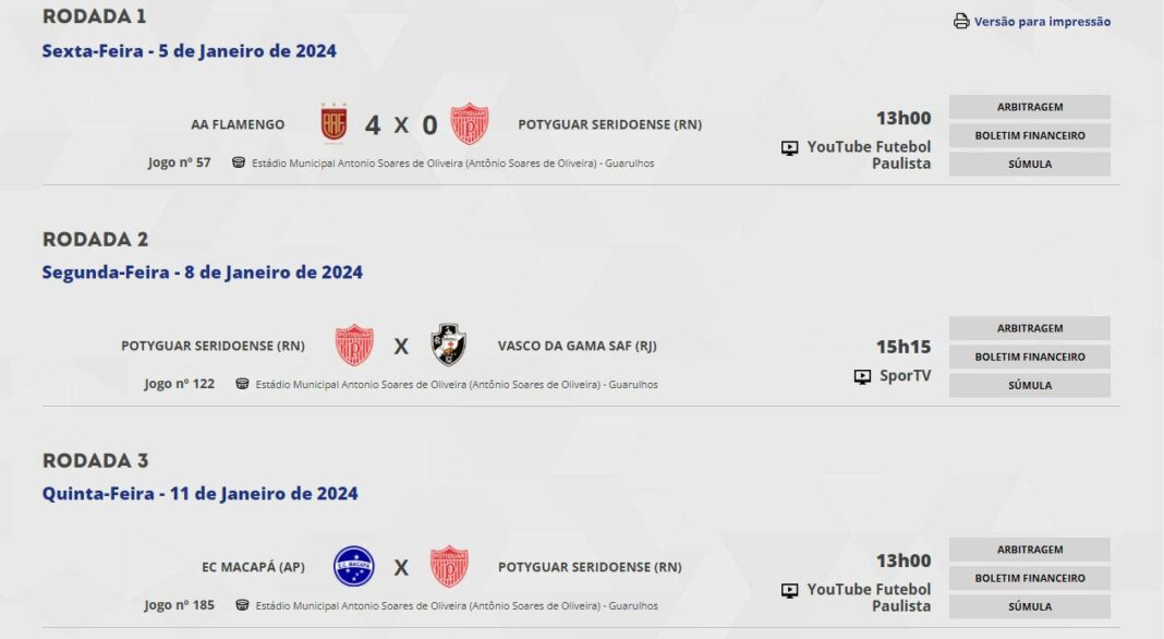 No site, consta os confrontos do Potyguar Seridoense na primeira fase. O nome do clube está correto, mas a imagem utilizada é do escudo do Potiguar de Mossoró, que não disputa a edição deste ano da maior competição de base do Brasil.