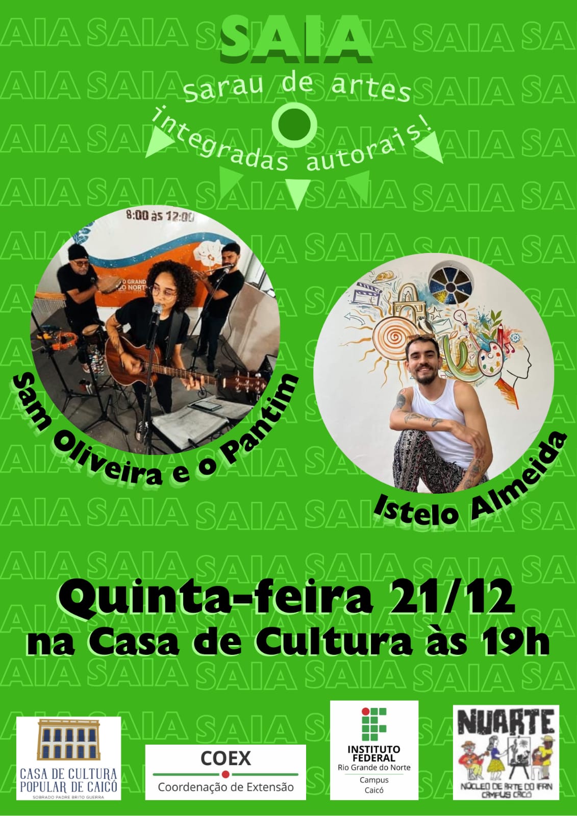 O SAIA – Sarau de Artes Integradas Autorais, é uma realização do NUARTE – Núcleo de Arte do IFRN, Campus de Caicó, em parceria com Casa de Cultura. O evento acontece a partir das 19h, com entrada gratuita.
