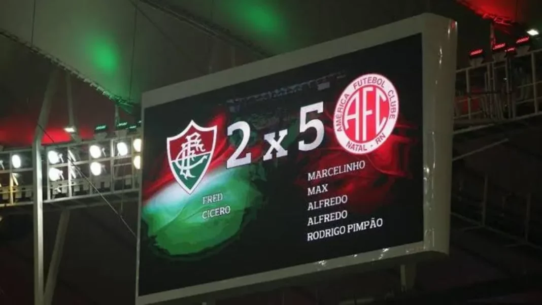 O América saiu na frente, mas antes do fim do primeiro tempo, o Fluminense virou o jogo para 2 a 1. Com isso, o América precisaria fazer 5 a 2 no segundo tempo para se classificar fora de casa. E foi o que aconteceu.