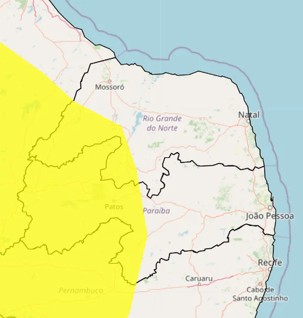 O alerta é a cor amarela, o que representa perigo potencial, o nível mais baixo de três no grau de severidade do Inmet – os dois acima são laranja (perigo) e vermelho (grande perigo).