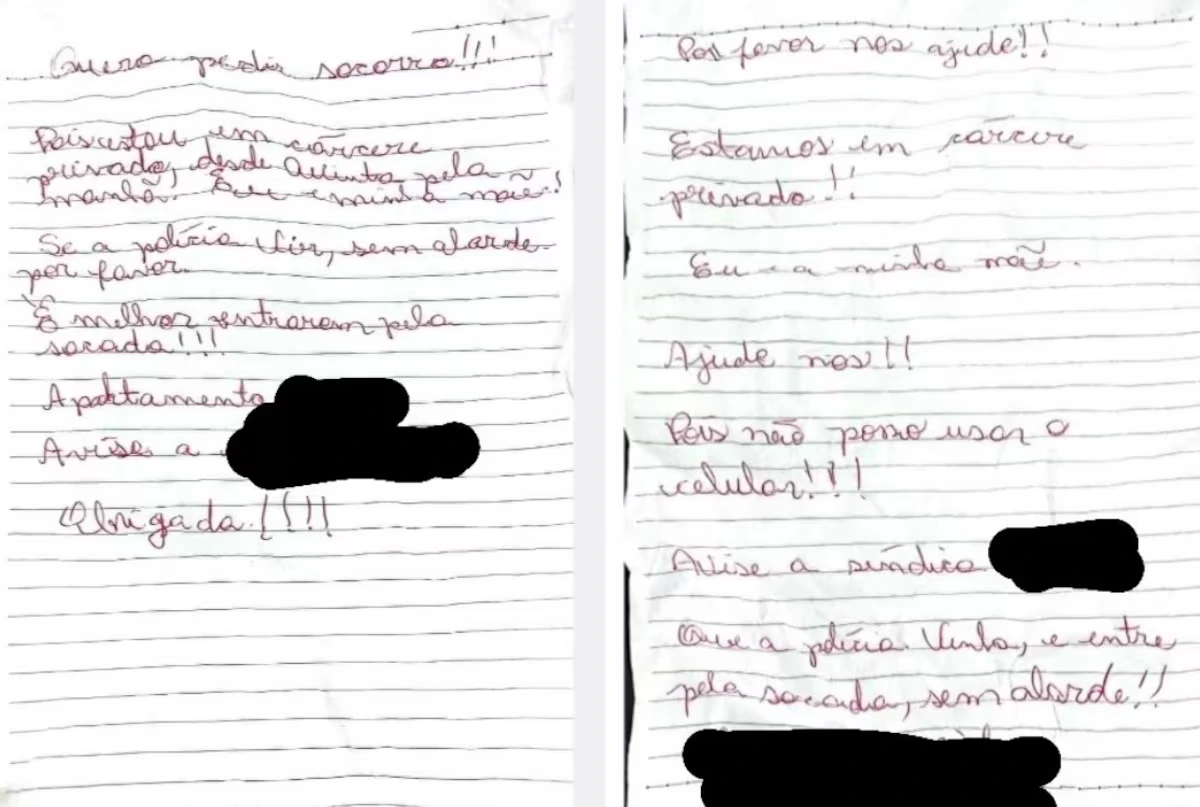 “Quero pedir socorro, pois estou em cárcere privado deste quinta (10 de julho) pela manhã. Eu e minha mãe”, diz um dos bilhetes. “Se a polícia vier, sem alarde, por favor. É melhor entrarem pela sacada.” “Ajude-nos, pois não nosso usar o celular.”