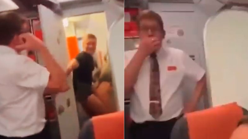 O comissário abriu a porta do banheiro a pedido dos passageiros. Dentro, é possível ver um homem e uma mulher com as calças abaixadas até os tornozelos. O homem fechou a porta rapidamente.
