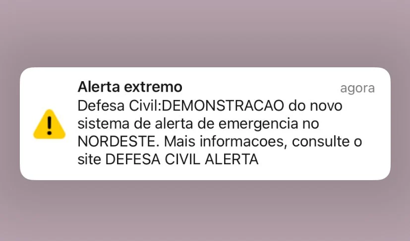Para quem recebeu a mensagem, seguida de sinal sonoro de cerca de 10 segundos, o texto dizia: “ALERTA EXTREMO – Defesa Civil: ALERTA DE DEMONSTRAÇÃO do novo sistema de alerta de emergência no estado. Para mais informações, consulte o site da Defesa Civil Alerta.”