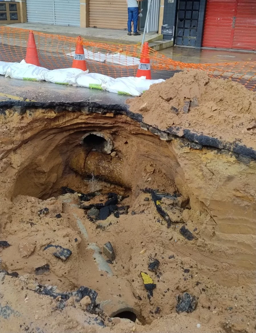 De acordo com a Secretaria Municipal de Infraestrutura (Seinfra), o problema foi causado pelo rompimento de uma tubulação de drenagem, o que resultou na abertura do buraco na via.