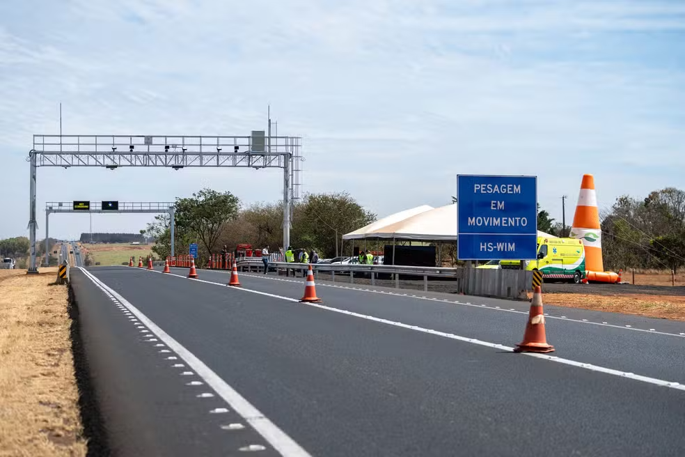 🎥Com o sistema, o veículo é pesado em alta velocidade, enquanto trafega pela rodovia. Isso faz com que o motorista não precise sair da via para realizar a pesagem em uma balança tradicional ou se negue a pesar o carregamento.