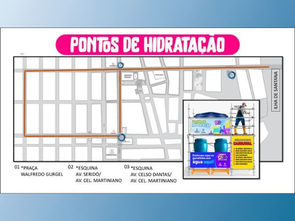 Com o intuito de garantir a hidratação dos foliões e oferecer alívio contra as altas temperaturas durante as festividades, a Secretaria de Saúde de Caicó distribuirá água ao longo do corredor da folia. Serão três estruturas instaladas estrategicamente ao longo do circuito dos blocos de rua.