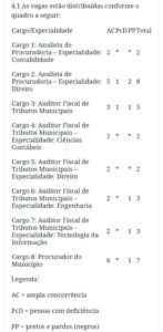 Ao todo, serão disponibilizadas 32 vagas, sendo 7 vagas para Procurador, 10 vagas para Analista Jurídico e 15 vagas para Auditor Fiscal do município, além de cadastro reserva.