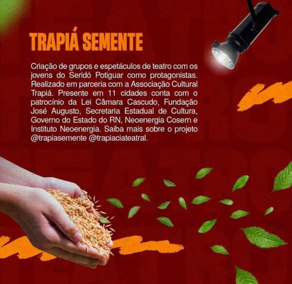 O Projeto Trapiá Semente é uma realização da Associação Cultural Trapiá através da Lei Câmara Cascudo e edital Transformando Energia em Cultura, do Instituto Neoenergia, com patrocínio do Governo do Estado do RN, Fundação José Augusto e Neoenergia Cosern, com produção da Mapa Realizações Culturais, e apoio das Prefeituras Municipais e Conselhos Municipais das Crianças e Adolescentes.