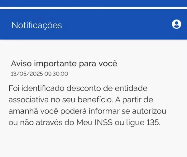 A mensagem divulgada é a seguinte: “Aviso importante para você. Foi identificado desconto de entidade associativa em seu benefício. A partir de amanhã você poderá informar se autorizou ou não através do Meu INSS ou ligue 135.”
