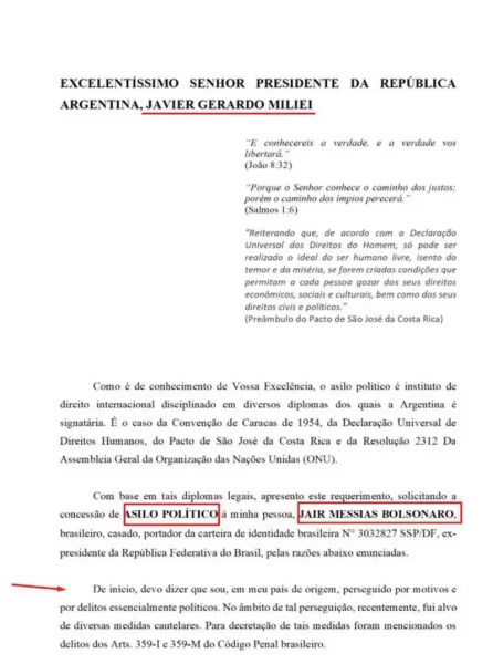 Outro elemento identificado pela PF no celular de Jair Bolsonaro foi um documento com a minuta de um pedido de asilo ao governo da Argentina, país presidido pelo aliado do ex-presidente Javier Milei.