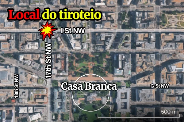 A polícia da capital dos EUA informou que o tiroteio ocorreu no cruzamento da 17th Street com a I Street, na região noroeste de Washington e a cerca de 500 metros da residência presidencial. Confira o local exato do tiroteio: