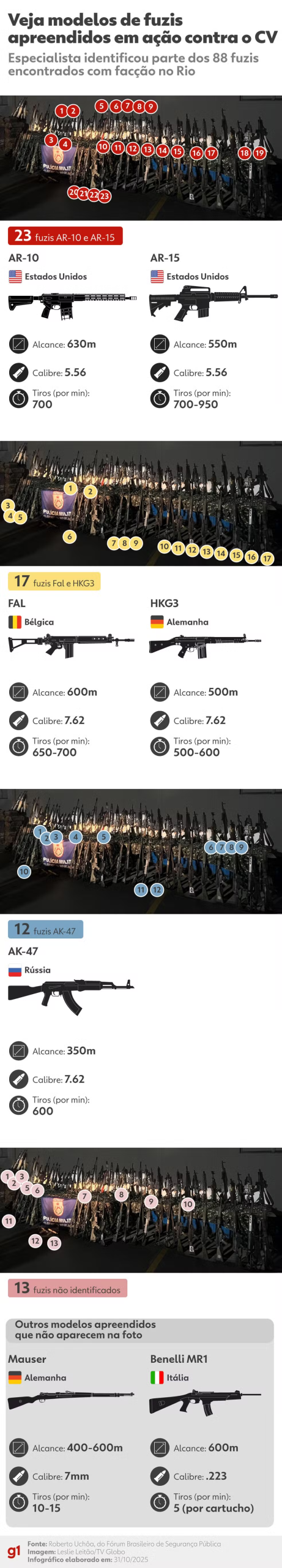 A Polícia do Rio de Janeiro realizou a maior apreensão de fuzis em uma única operação em favelas: foram ao menos 91 armas. Estes armamentos, encontrados na megaoperação contra o Comando Vermelho (CV) no Complexo do Alemão, são de calibres capazes de perfurar coletes à prova de balas ou até mesmo paredes. Muitos desses fuzis chegam ao Brasil via fronteira com o Paraguai ou pela Amazônia.