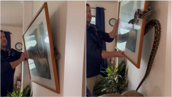 Os moradores suspeitaram de algo estranho após ouvir barulhos na parede. Um biólogo especialista da Sunshine Coast Snake Catchers foi chamado até o local para fazer o resgate da cobra que estava atrás de um quadro.