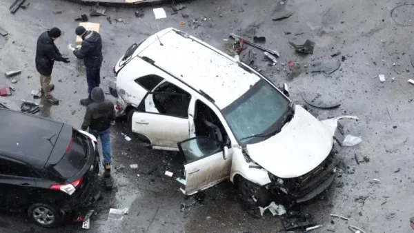 Imagens da área mostram um carro branco gravemente danificado, com as portas arrancadas pela explosão, cercado por outros veículos.