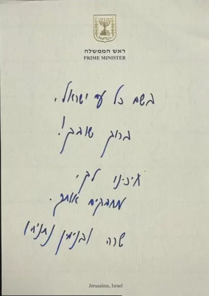 Uma nota manuscrita do primeiro-ministro israelense Benjamin Netanyahu e sua esposa Sara Netanyahu faz parte de um kit entregue aos reféns recém-libertados quando eles chegarem de volta a Israel.