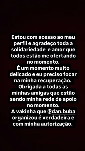 “Estou com acesso ao meu perfil e agradeço toda a solidariedade e amor que todos estão me ofertando no momento. É um momento muito delicado e preciso focar na minha recuperação. Obrigada a todas as minhas amigas que estão sendo minha rede de apoio no momento”, declarou.