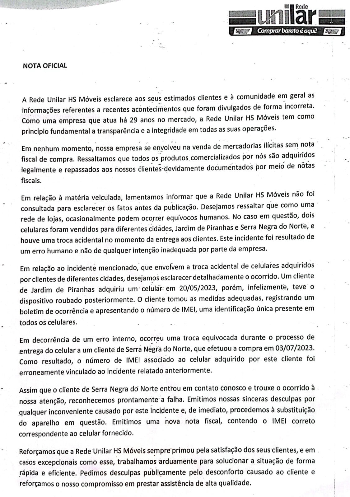 (i) na publicação que tornou pública toda a história está bem claro que ficou narrado os fatos tão somente sobre a venda de um aparelho que tinha registro policial de furto na delegacia de Jardim de Piranhas… a nota da Unilar confirma;