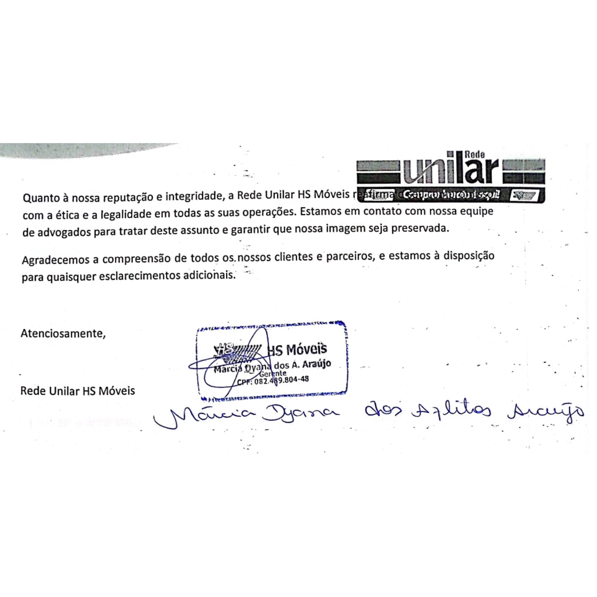 (iii) a loja Unilar afirma a intenção de dar “assistência de qualidade” a cliente vítima, mas não informa claramente o que isso significa;