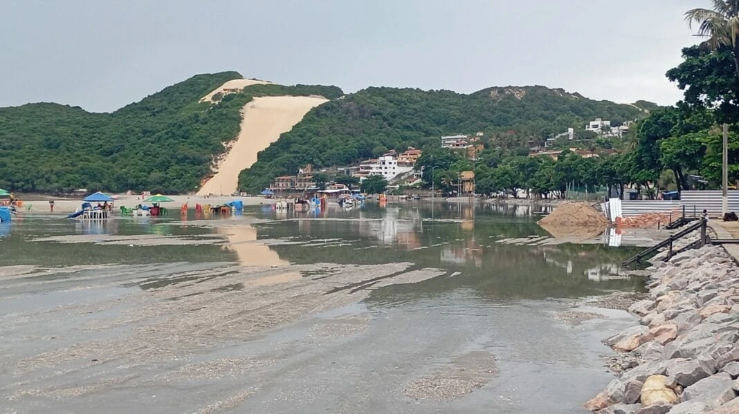Segundo a Seinfra, o projeto inicial da drenagem direcionava a água das chuvas para a faixa de areia ampliada, formando “espelhos d’água” que deveriam infiltrar no solo em poucas horas. A Prefeitura, no entanto, reconheceu que o acúmulo dessa água tem gerado insatisfação na população.