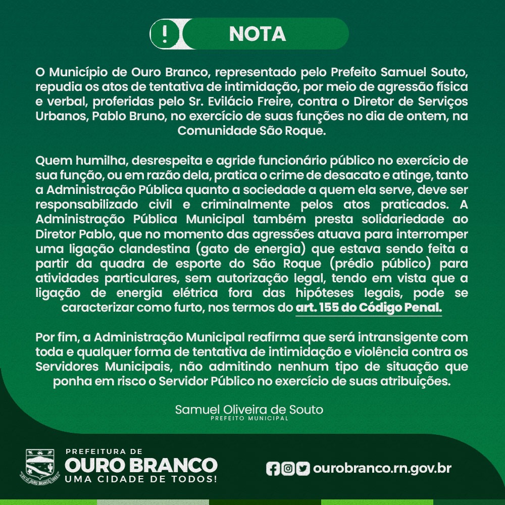 A Prefeitura Municipal de Ouro Branco, representada pelo prefeito Samuel Souto, reproduziu uma nota nas redes sociais, lamentando e repudiando o ocorrido que, na verdade é um crime de desacato.