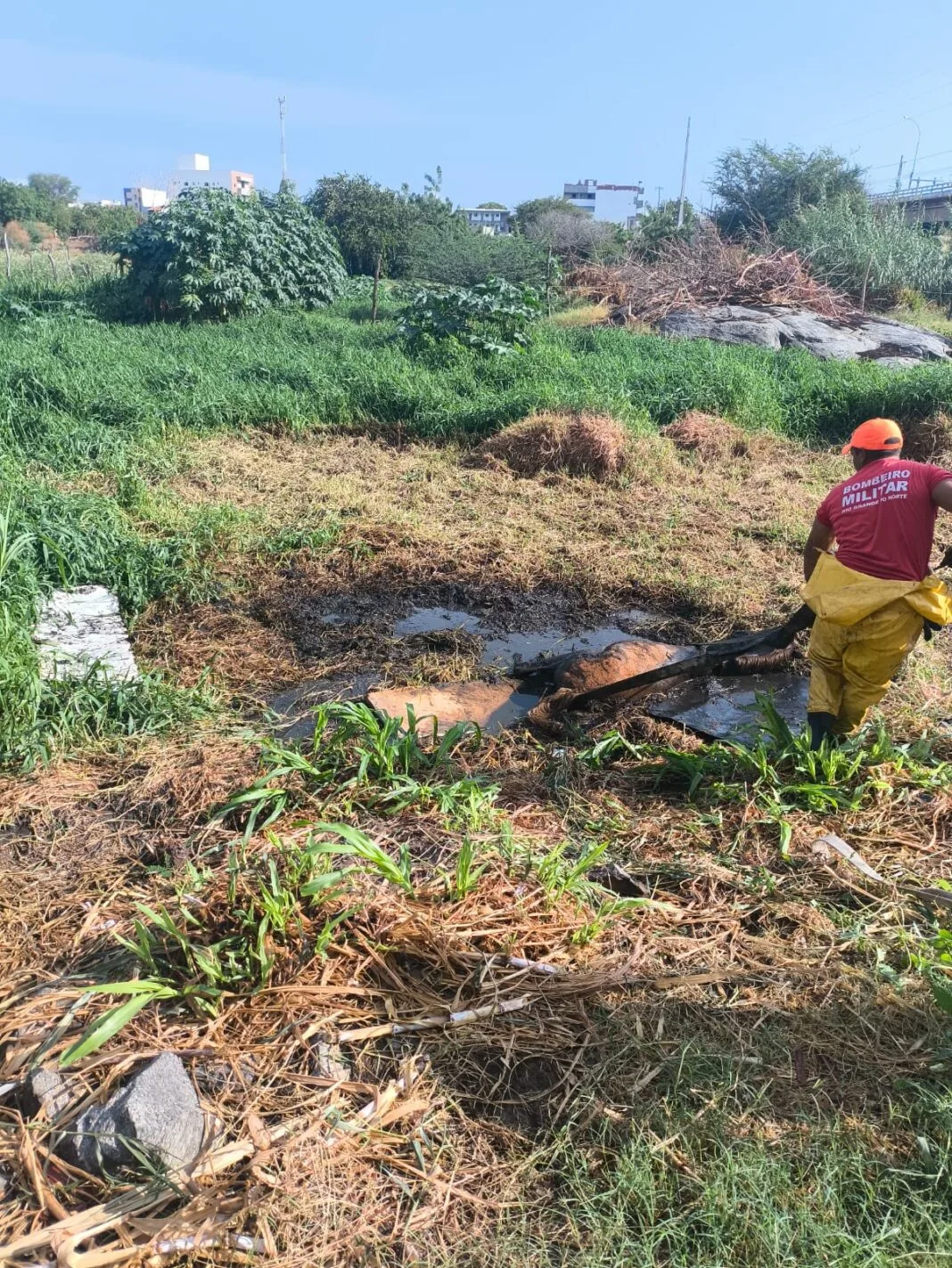 Ao chegar ao local, a guarnição constatou que o animal estava atolado, sem conseguir se movimentar, apresentando sinais de exaustão devido ao esforço para se libertar. Os bombeiros empregaram técnicas de salvamento terrestre, com uso de equipamentos específicos, amarrações seguras e trabalho coordenado da equipe, garantindo a estabilização do cavalo e a retirada gradual da área de risco.