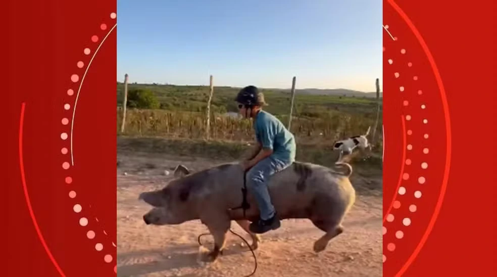 Entre muitos vídeos postado, um em especial chamou a atenção dos seguidores… A que ele aparece montado na porca Foguete. Isso mesmo, ele monta no animal em alta velocidade, usa capacete e até decora a amiga porca com laços e roupinhas.
