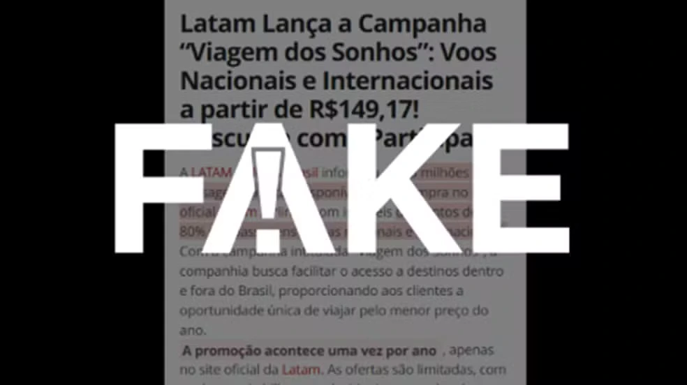 Circula nas redes sociais uma publicação que imita a aparência do g1 e anuncia que a Latam teria lançado a campanha “Viagem dos Sonhos”, com passagens para voos nacionais e internacionais a partir de R$149,17. É #FAKE.