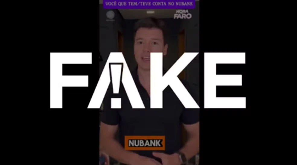 Os dois anúncios levam a um site falso, que simula o do Nubank, no qual o usuário precisa inserir o CPF para avançar. Depois, a tela mostra o valor de saque disponível e reproduz uma reportagem em vídeo mentirosa, que usa trechos manipulados por IA de um conteúdo originalmente veiculado pelo Jornal Nacional, da TV Globo.