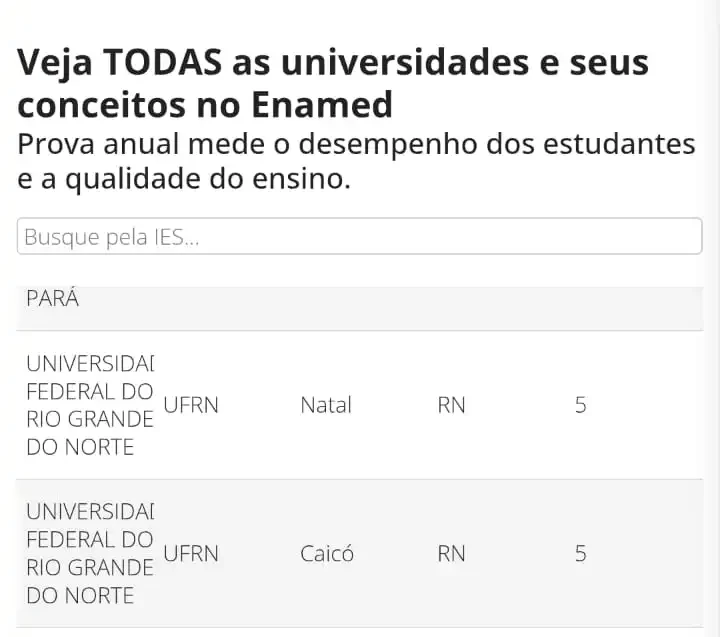 A Universidade Federal do Rio Grande do Norte (UFRN) obteve conceito Enade 5, a nota máxima, nos cursos de Medicina ofertados nos municípios de Natal e Caicó, de acordo com o resultado da primeira edição do Exame Nacional de Avaliação da Formação Médica (Enamed), divulgado nesta segunda-feira 19 pelo Ministério da Educação (MEC), durante café com jornalistas.