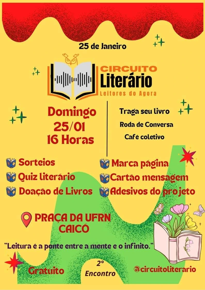 Depois do sucesso do primeiro encontro, o Mulheres do Agora está organizando a segunda edição do Circuito Literário – Leitores do Agora, que acontecerá no dia 25 de janeiro de 2026, a partir das 16h, na praça da UFRN/CERES, em Caicó.