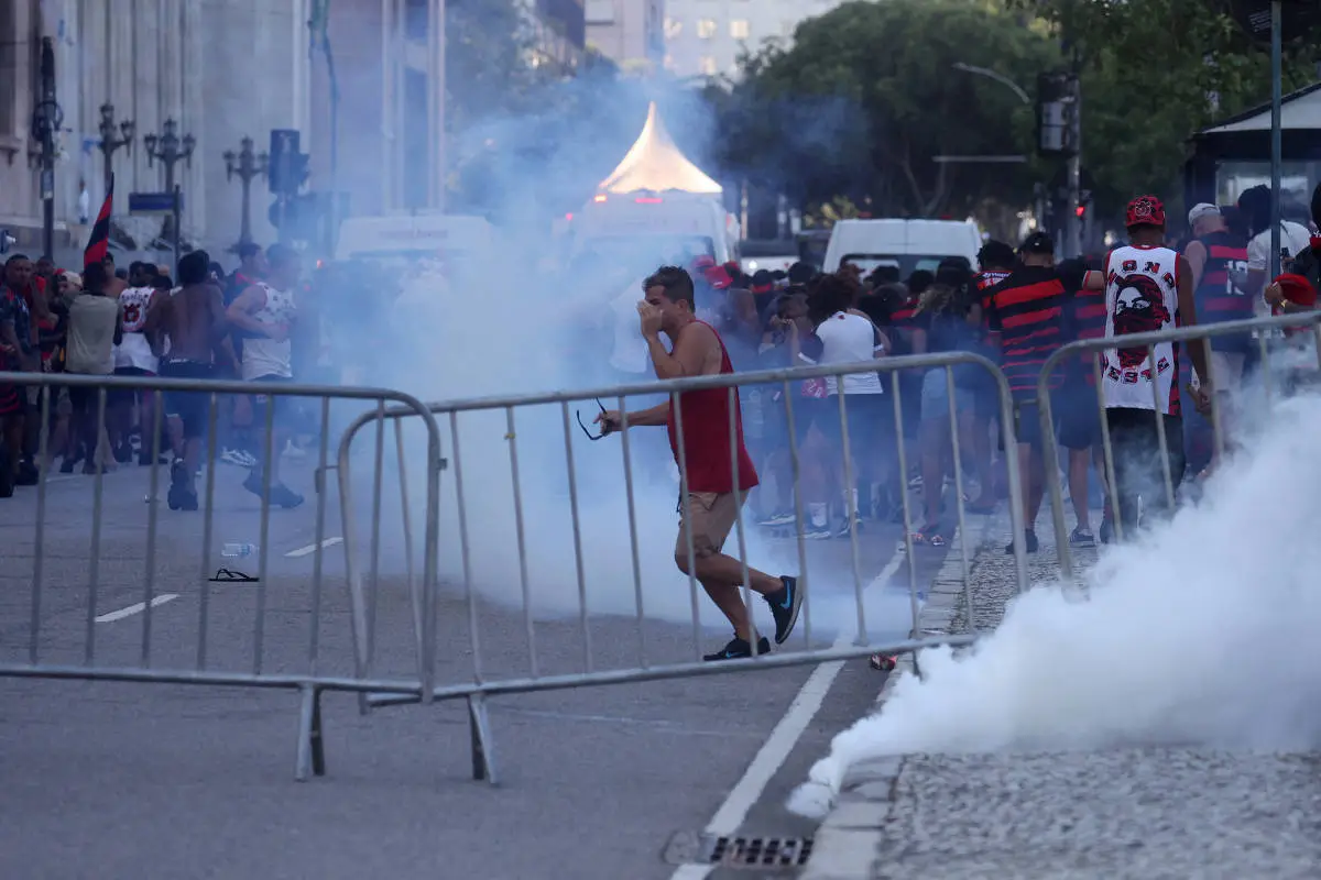 A celebração do tetracampeonato da Libertadores do Flamengo terminou em confusão na tarde deste domingo (30), no centro do Rio de Janeiro. Pouco depois de o trio elétrico com jogadores e comissão técnica encerrar o trajeto pela rua Primeiro de Março, torcedores que acompanhavam o cortejo entraram em confronto com policiais militares, que reagiram com gás de pimenta e disparos de balas de borracha.