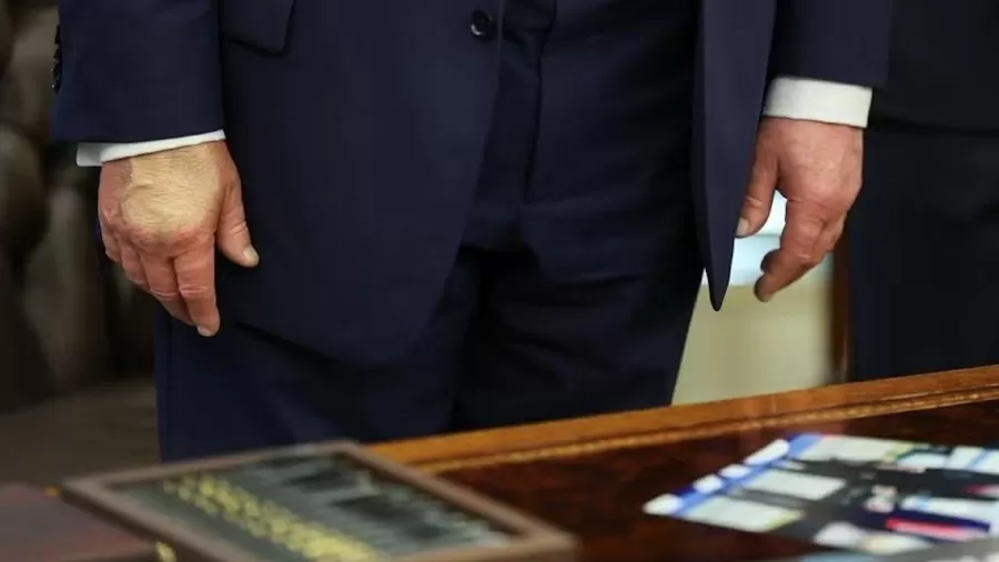 Detalhe na mão de Trump foi visto em evento oficial na Casa Branca. Na sexta-feira (22), ele recebeu em Washington o presidente da Fifa, Gianni Infantino, e chamou atenção pela forma como tentou esconder o dorso da mão direita. Antes, especulações acerca de sua saúde aumentaram depois que fotos mostraram hematomas na mão dele.