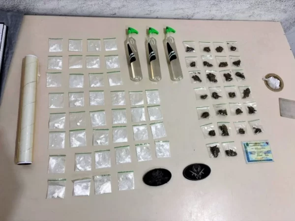 A mulher suspeita, recepcionou a equipe e autorizou, os policiais realizaram a revista na residência, onde localizaram 26 pacotes pequenos de substância análoga à maconha, 40 pacotes pequenos de substância análoga à cocaína, três frascos de substância análoga a lança-perfume, um rolo de papel-filme utilizado para embalo de entorpecentes e um aparelho celular. Parte do material estava escondida em um fundo falso de uma mesa.