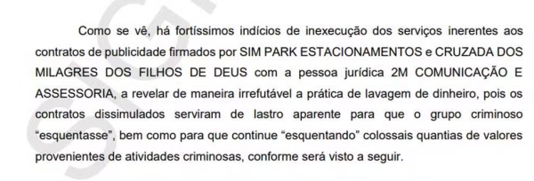“Nesse sentido, resta claro que os contratos de publicidade firmados pela empresa da esposa do Prefeito de Sorocaba/SP, o investigado Rodrigo Maganhato, com as pessoas jurídicas acima relacionadas, não passam de ficção, um estratagema elaborado com a finalidade de reinserir na economia formal os vultosos valores de origem ilícita, provenientes da atividade criminosa desenvolvida pelo grupo, intrinsecamente vinculada ao exercício do nobre cargo eletivo de prefeito municipal (…).”