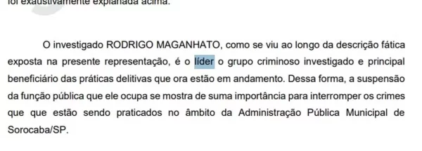 “O investigado Rodrigo Manga, como se viu ao longo da descrição fática exposta na presente representação, é o líder o grupo criminoso investigado e principal beneficiário das práticas delitivas que ora estão em andamento. Dessa forma, a suspensão da função pública que ele ocupa se mostra de suma importância para interromper os crimes que que estão sendo praticados no âmbito da Administração Pública Municipal de Sorocaba/SP.”