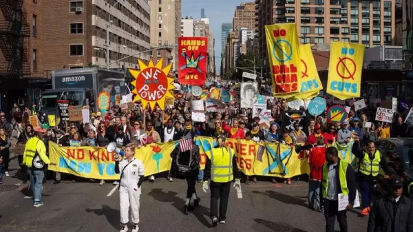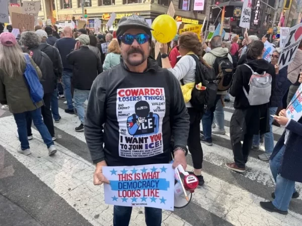 Beth Zasloff, escritora e editora freelancer, disse que se juntou ao protesto em Nova York porque se sente indignada e angustiada com o que chamou de “movimento em direção ao fascismo e a um governo autoritário” que estaria em curso no governo Trump.