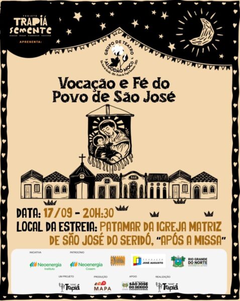 No próximo domingo (17), às 20h30, acontece o espetáculo “Vocação e Fé do Povo de São José “, no patamar da Igreja Matriz. O espetáculo traz a história de São José da Bonita e São José do Seridó, o passado e o presente entrelaçados pela cultura do cultivo do algodão mocó até a chegada das tecelagens, e novas indústrias.